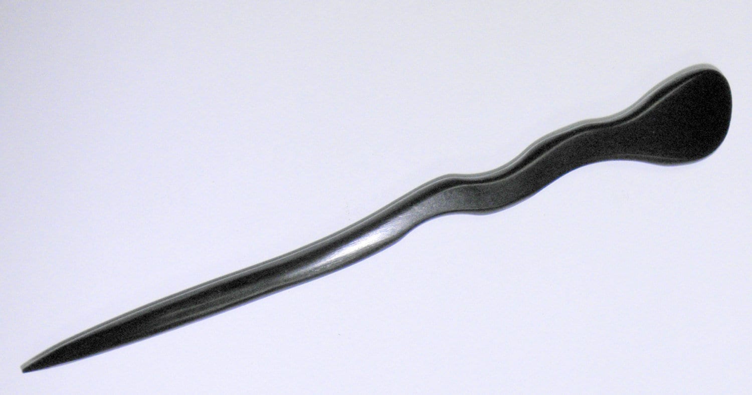 The Hair Stick is 6 inches long and undulates from 1/2" at the top down to a point. The Stick is about 1/4" in thickness , a deep black color and and able to hold lots of hair securely. This stick is as strong as any wooden Hair Stick you will find on the market.
