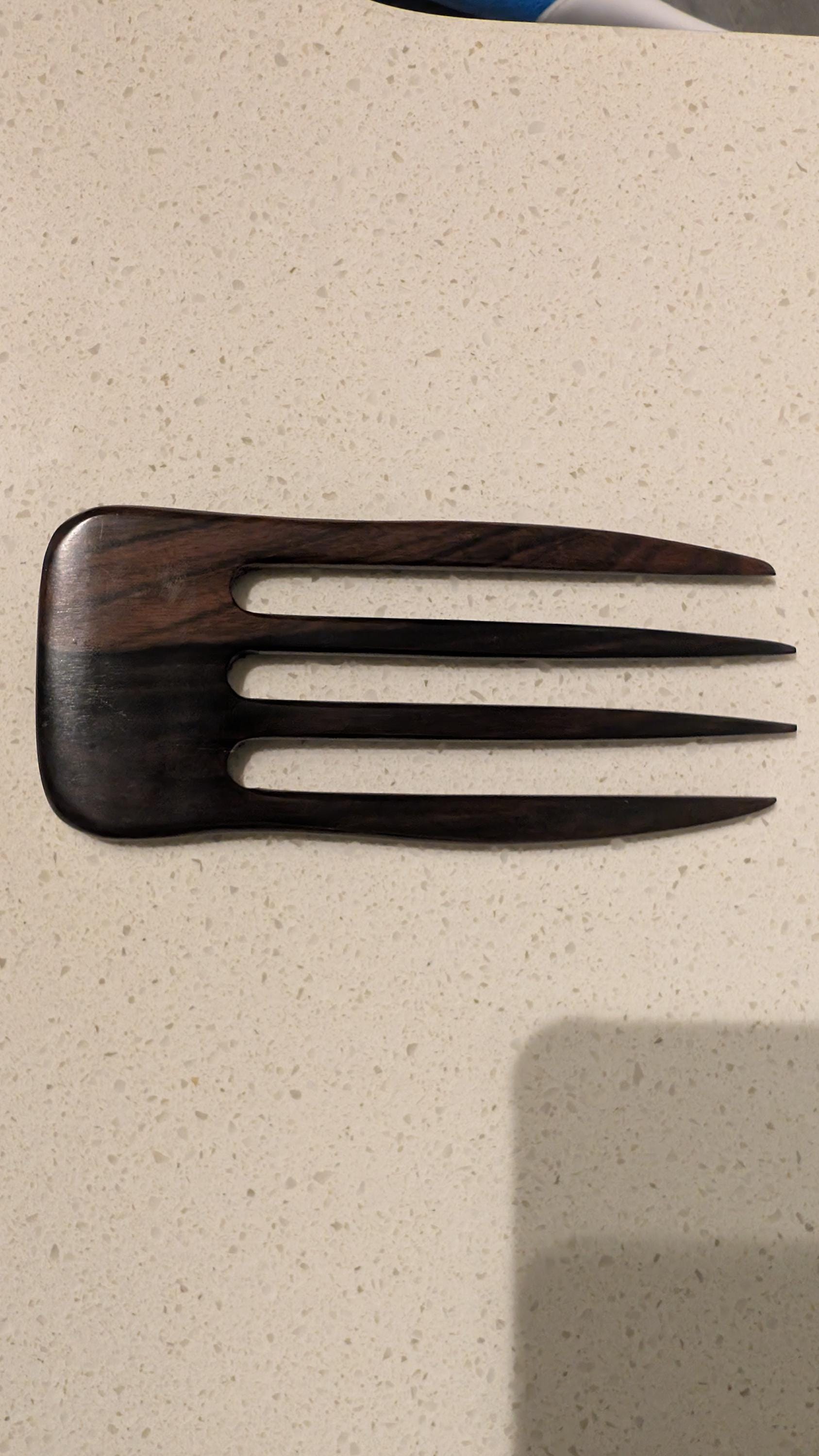 The 6 Inch Striped Ebony Four Prong Hair Fork is straight and can be used from several angles. . This Straight Striped Ebony Four Prong Hair Fork is a "Rustic Heavy Duty " hair fork I have added to my line for the customer with Thick Hair that needs a super strong Hair Fork with great holding power. . It is 2 5/8 " wide; 6" long and 1/4" thick. The pictures do not do justice to this Hair Fork.