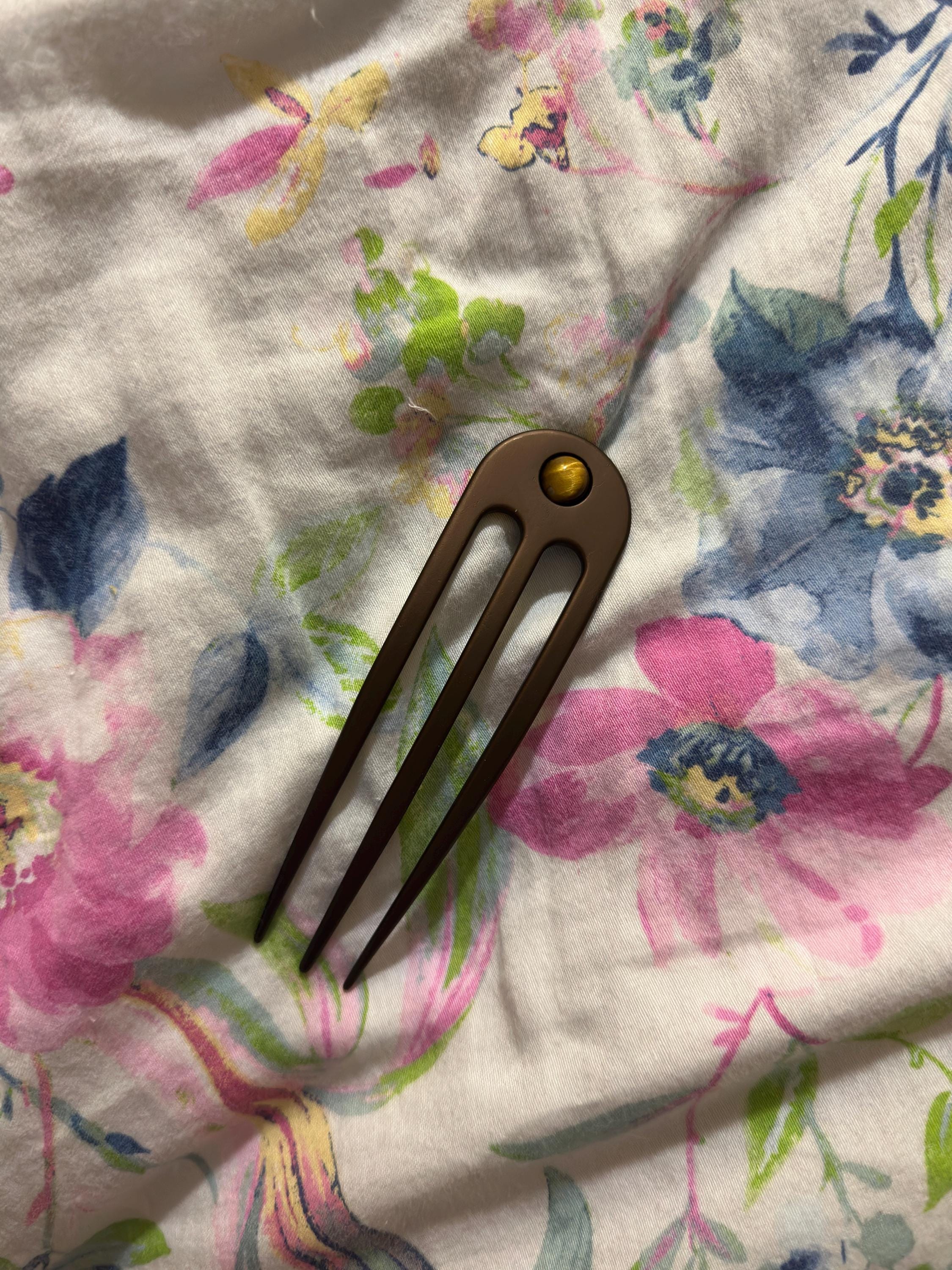 This sale is for One Brown Colored Anodized Aluminum 4.9 inch Curved Three Prong Hair Fork. Each has a stone added to them to add a little sparkle. They are 4.9 inches long and a little over one inch wide and 1/8 of an inch thick. This Hair Fork is curved to fit the contour of your head.